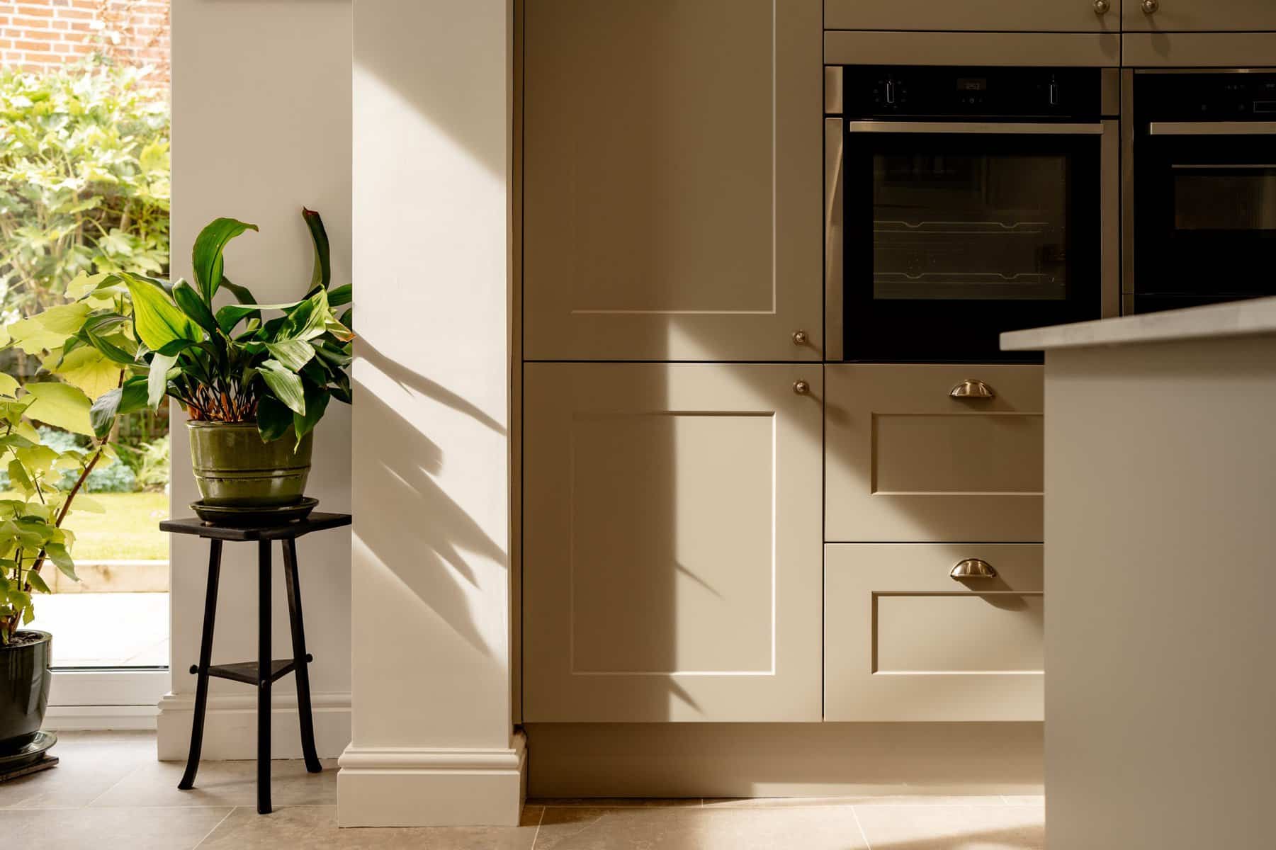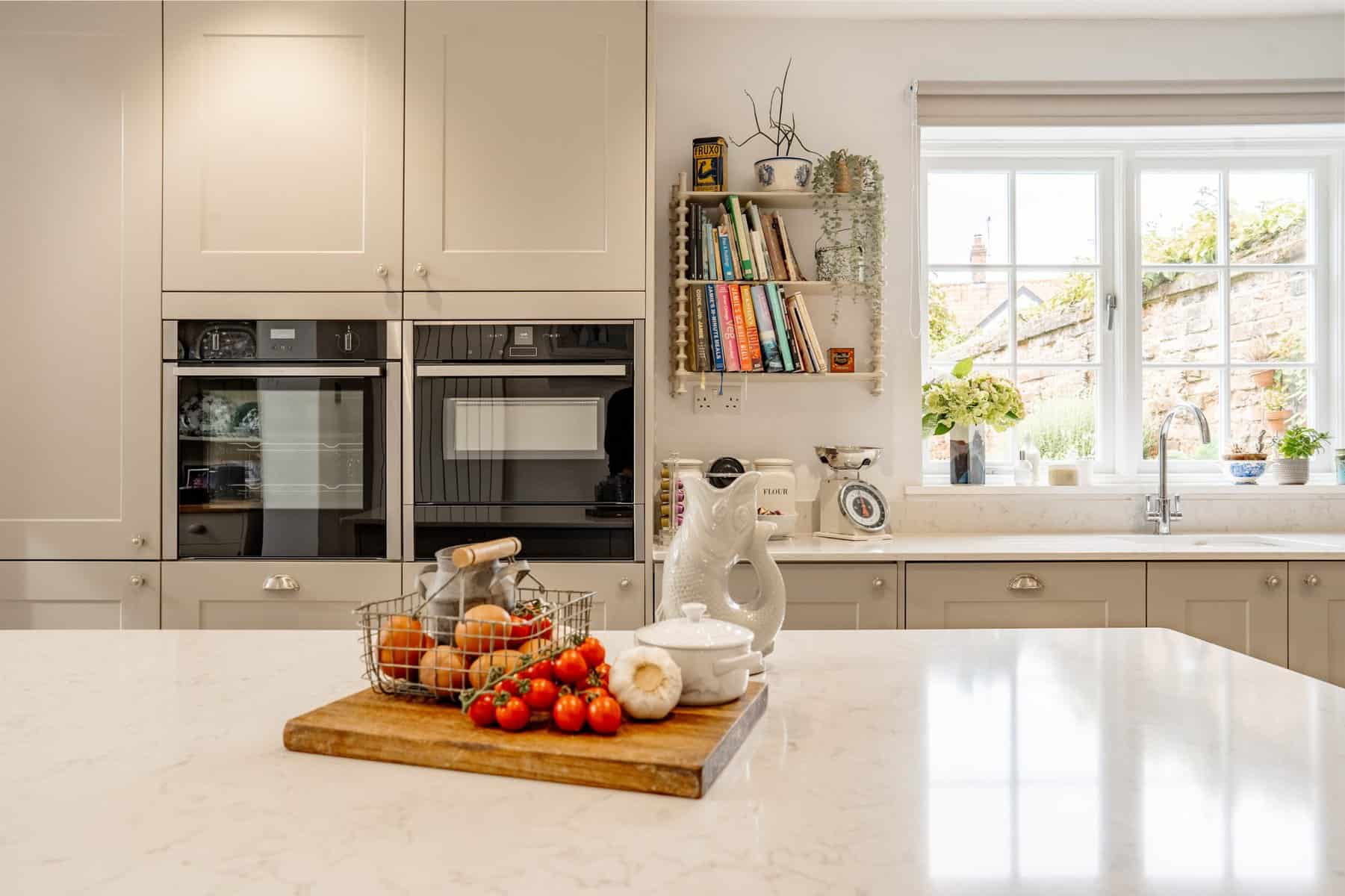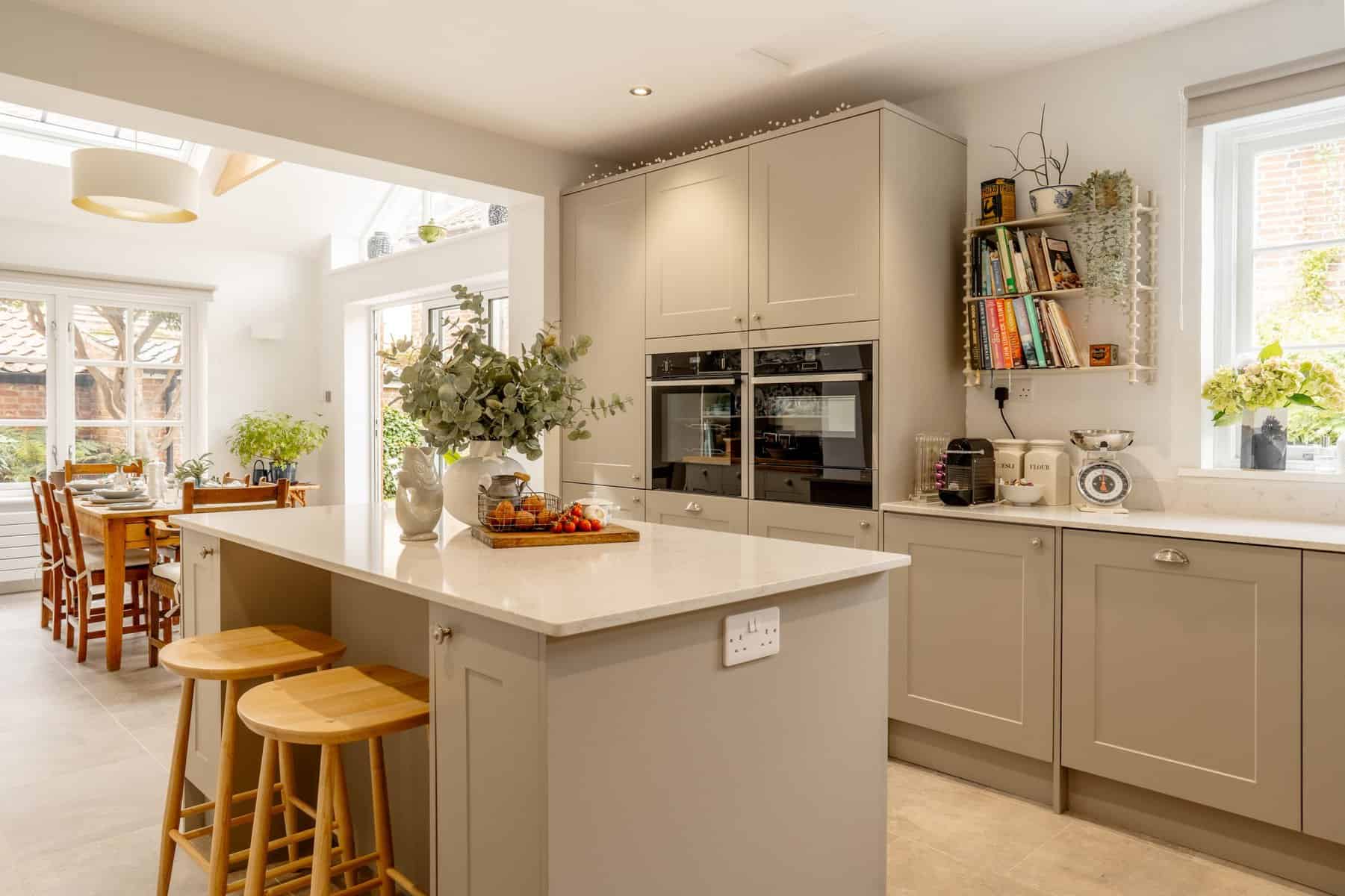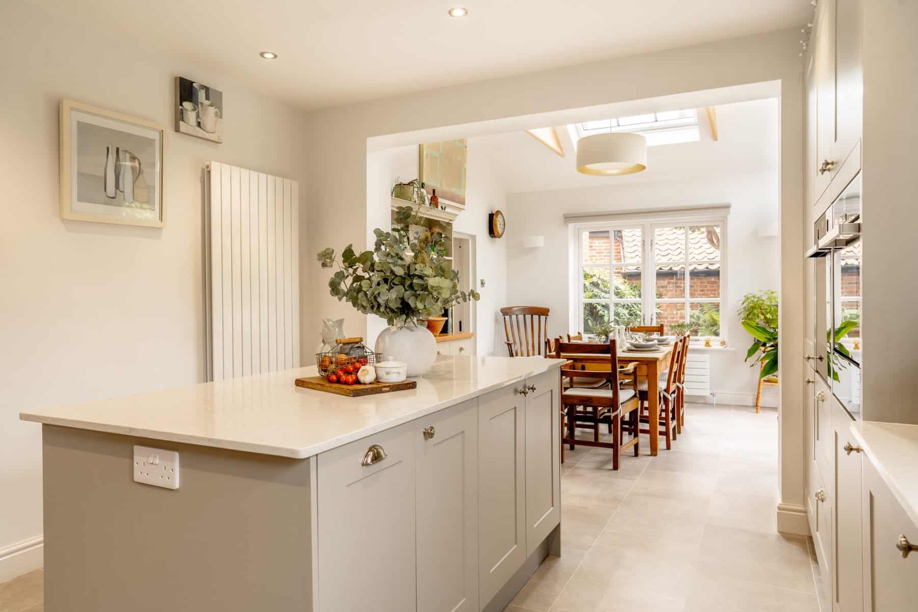 There’s a fantastic flow from room to room, winding up that classic staircase to the master suite and further bedrooms extending to the second floor, but all roads lead back to the vaulted, open plan kitchen dining space. An exercise in minimalist tranquillity with a touch of period elegance to get the balance just right, the kitchen pairs modern function with a heart of the home feel. Finished with soft pebble cabinets, the sleek white stone counter tops radiate the natural light which floods through the bi-folding doors and skylights above within the vaulted ceiling. With a wide range of integral appliances, this space is a true chefs delight with the essential space needed to socialise and dine.
